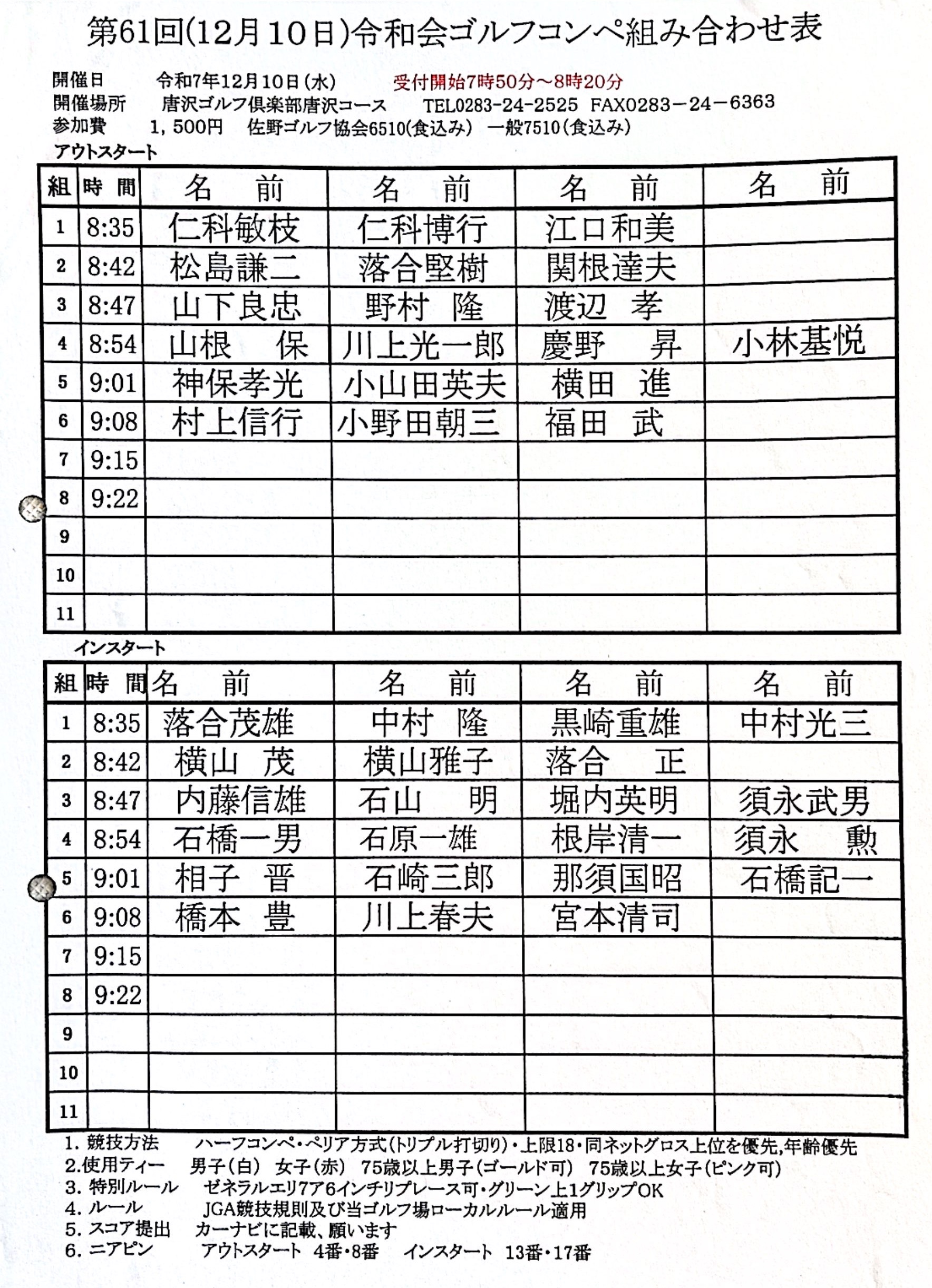 第61回(12/10)令和会・組合せ表 は