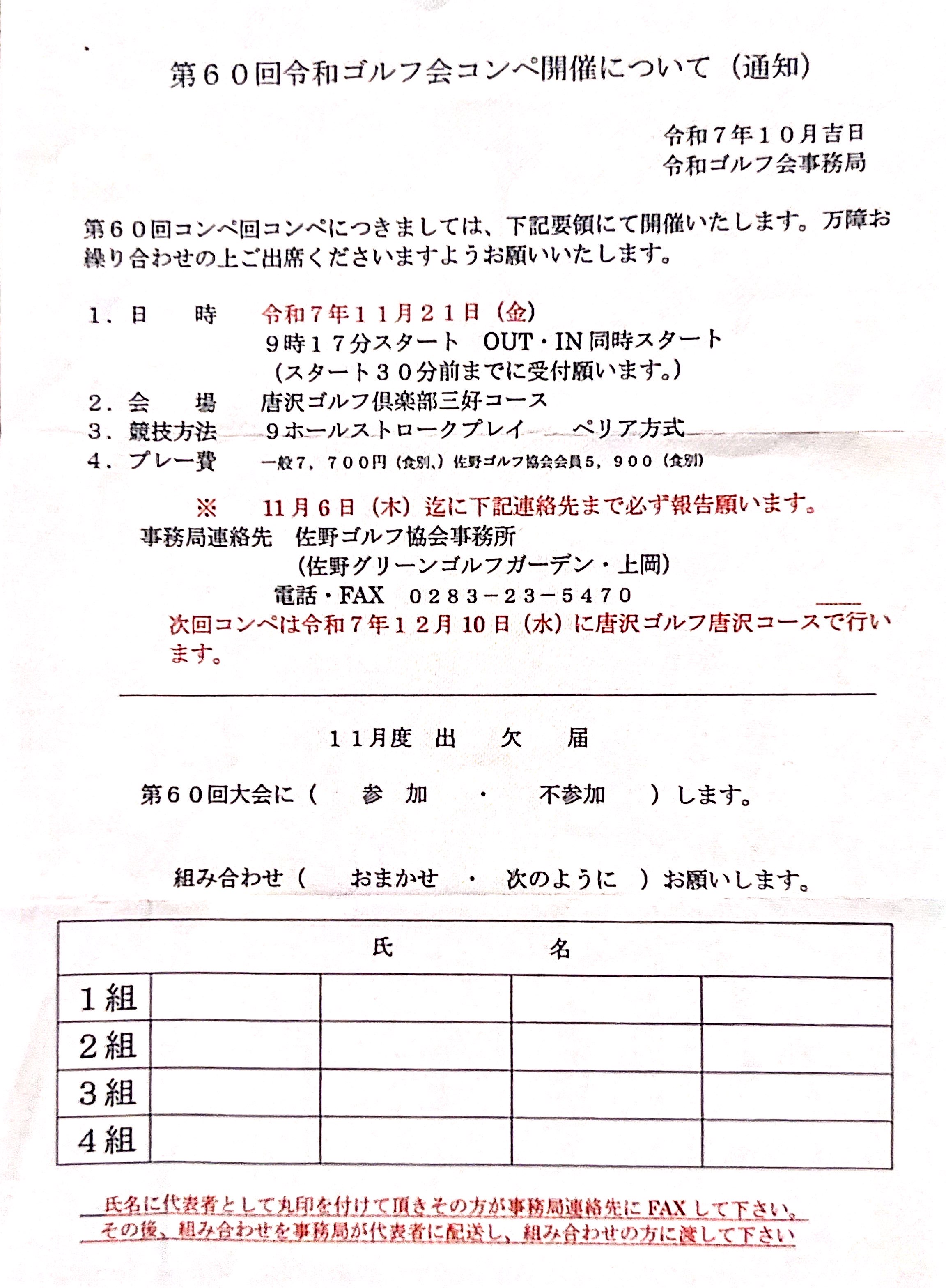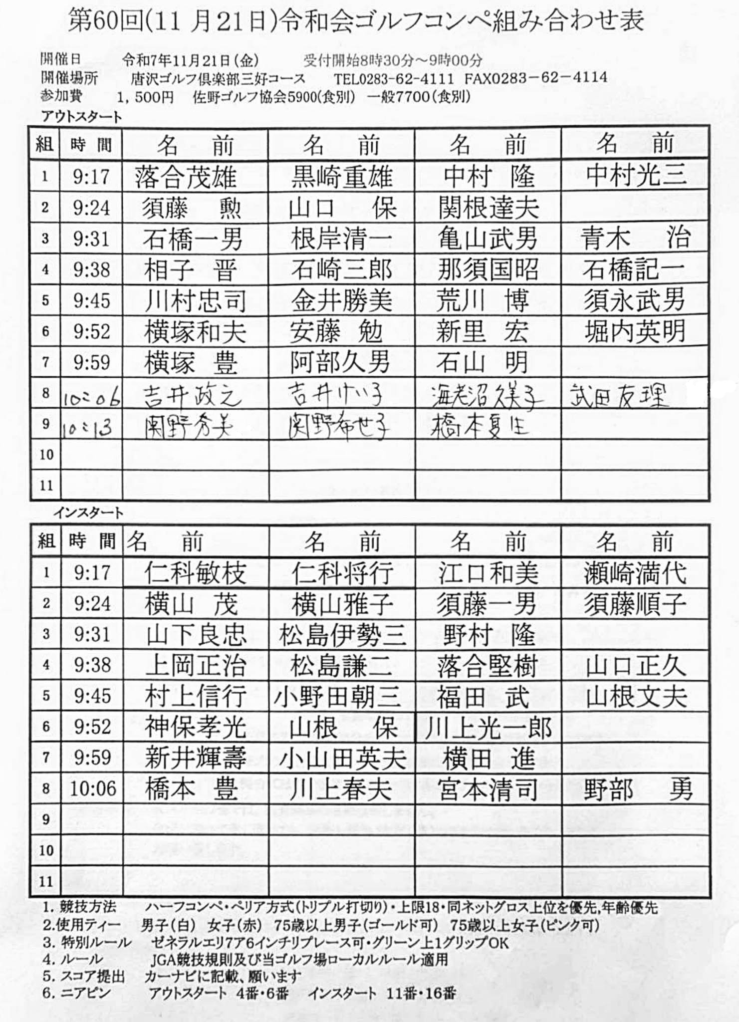 第60回(11/21)令和会・組合せ表 は